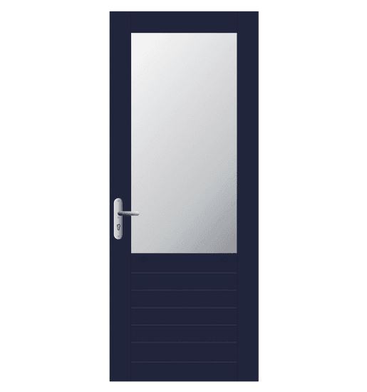 Achterdeur. Massief hardhout in FSC® of NON-FSC®. Leveringen onder KOMO keurmerk, PKVW keurmerk en 6 jaar garantie. Afwerking: voor- of aflak in een RAL kleur.